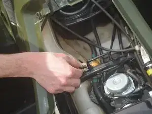 Use a wrench with a 10 mm socket to remove the hex bolt that secures the green plastic panel on the right side of the four wheeler.