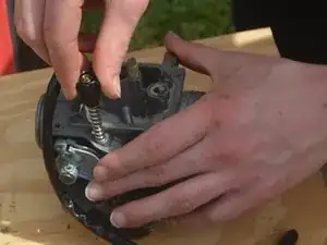 Twist the spring-loaded mechanism located underneath the black cover that was just removed in the previous step in order to loosen and slip the throttle cable out of the inside of the carburetor.