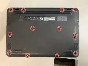 Flip the computer over, and using a Phillips #1 screwdriver, remove all 12 bottom cover screws.