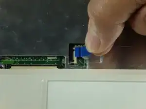 • Slide out the touchpad's ribbon connector by pulling the blue tab to the right.