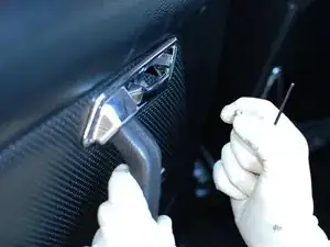 On the driver's side door, with no upper section of the arm on the door panel, the chrome panel behind the door pull can simply be removed and set aside at this point.