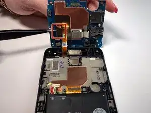 Using the tweezers, detach the gold ribbon from the logic board where they connect.