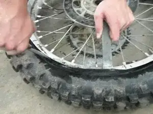 • Then take the dirt bike tire iron and wedge it between the rim and tire. Once wedged use leverage from the rim to pull the tire up and away.
