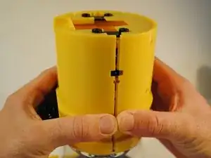 To disassemble the main body, grip the lantern so that the front half of the body with the power button on it is in your right hand and the back half with the hand crank is in your left.