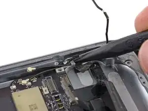 Use the flat end of a spudger to loosen the foam adhesive securing the Wi-Fi antenna to the left speaker.