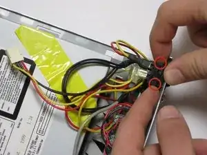 Take out the fan and its cords, by pulling it outward from its cavity within the device.
