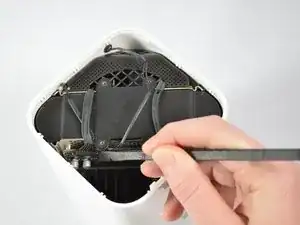 When putting the cover back on after completing the fan replacement, be sure you put the side with the cutout on the same side of the Airport that has the LAN and power connectors. The black cover can only go back on in one correct position. Look at the inside bottom of the black cover and you’ll see one side is configured differently. Place that different side to align with the LAN and power holes of the Airport unit, then push it down gently into place.