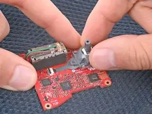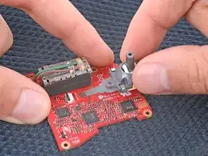 Lift the right edge of your device and push the thumbstick assembly firmly into place so the small circular cutouts on the right edge go over their alignment posts. The board should stay firmly in place.