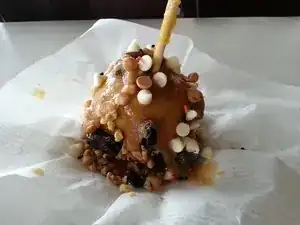 Remove the apple from the caramel, twisting it in the air, allowing the caramel to cool slightly.