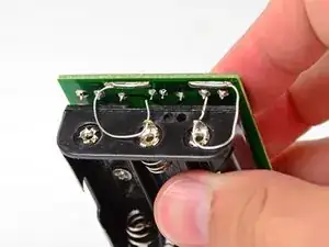 Per saldare le gambe della batteria alla scheda logica, appoggia la punta del saldatore sulla saldatura del polo positivo.