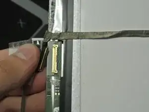 Peel the tape off the cable connected to the back of the LCD screen and unplug the cable which is connected to the bottom. The screen should now be fully removed from the laptop casing.