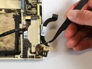 Disconnect the metal component of the thin, black component by lifting it up with the spudger.