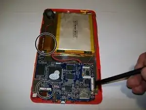 Now that the battery and speaker are removed, the black clips are undone, and the motherboard is unscrewed, remove the motherboard.