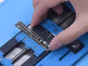 Attach the motherboard to the holder. Heat with Hot Air Gun at 260 °C and airflow 2 to remove the black adhesive.