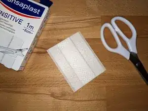 Now, carefully cut a small triangle out of the bandage on both adhesive sides, up to the gauze pad. Cut the triangles out exactly in the middle. This will create four "little wings", as seen in the second picture.