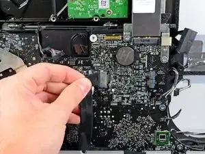 Tira il connettore della ventola CPU/temperatura ambientale verso il bordo inferiore sinistro dell'iMac per scollegarlo dalla sua presa sulla scheda madre.