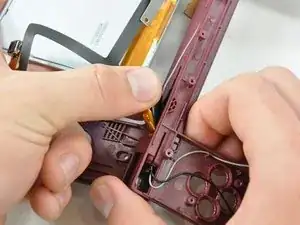Pull the Wi-Fi antenna cable through the right hinge connecting the front bezel and upper case.