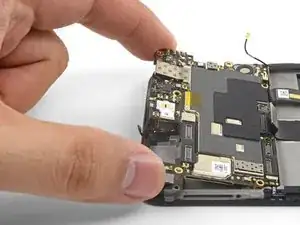 Slide the point of a spudger underneath the antenna interconnect cable that is connected to the motherboard above the vibration motor.