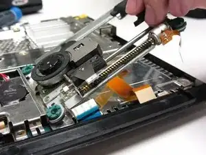 you also must disconnect the ribbon cable from the laser assembly by flipping back the little brown lever and removing the cable. This frees the assembly from the rest of the console. To actually replace the drive, you need to move the lens away from the disc hub by gently turning the worm gear. Flip the new assembly over and connect the brown ribbon that is glued to the metal shield. DO NOT REMOVE THE GLUED RIBBON UNLESS YOU INTEND TO REPLACE IT. After that one is connected, you can slowly flip the assembly and rest is in place. Connect the other ribbons to their respective connectors. Return all the screws to their positions and tighten so they are firm. Don’t go overboard screwing them back in.