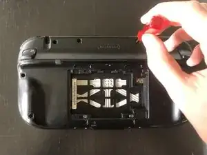 Rimuovi le copertine delle viti con il plettro e usa il cacciavite Tri-wing per svitare le viti che circondano il GamePad.