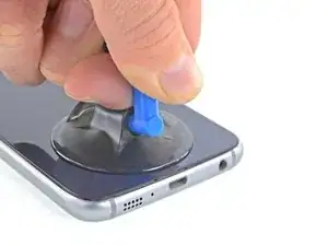 Lift on the suction cup to create a small gap underneath the rear glass, and insert an opening pick into the gap.