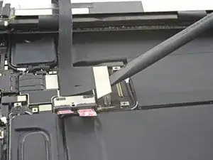 Usa l'estremità appuntita di uno spudger per sollevare e scollegare i due cavi superiori dello schermo.