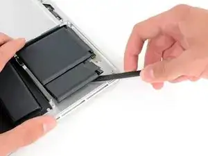 Tutto rallenta quando passiamo alle celle esterne e iniziamo lentamente a passare lo spudger sotto i bordi. Avanziamo cautamente ascoltando con attenzione i rumori dell'adesivo che si rompe finché tutte le sei celle sono libere.