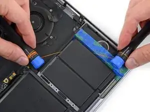 Prima di inserire una nuova batteria, rimuovi tutta la colla rimasta sulla scocca del MacBook Pro.
