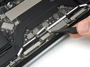 Solleva il connettore quanto basta perché resti separato dal suo zoccolo. Se dovesse fare contatto accidentalmente nel corso della tua riparazione, il tuo MacBook Pro si potrebbe danneggiare.