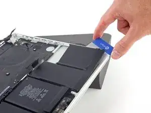 Inserisci uno strumento di apertura tra il cavo a nastro del trackpad e la batteria.