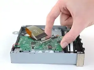 Usa la punta di uno spudger, un plettro o un'unghia per sganciare la piccola aletta di bloccaggio incernierata sul connettore ZIF del lungo cavo a nastro nell'angolo del lettore CD.