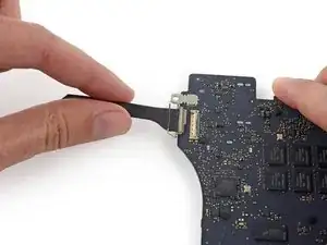 Solleva lievemente il bordo interno della scheda I/O e spingi la scheda stessa verso il centro del MacBook, lontano dal bordo laterale.