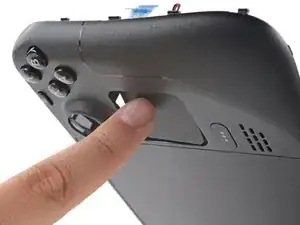 Dal lato anteriore dello Steam Deck, usa le dita per spingere il trackpad destro parzialmente attraverso la scocca frontale per rimuoverlo dal suo alloggio.