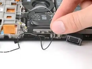 Grab the right speaker and unhook its cable from the two retaining tabs in the midframe.