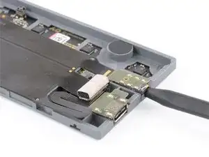 Slowly pry the USB-C connector out of its recess. Use the flat end of a spudger on the small nib on the USB-C board.