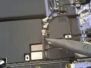 Use a spudger, an opening tool, or your fingernail to flip up the small, hinged locking flap on the power button board cable's ZIF connector.