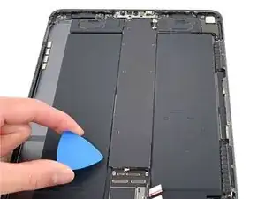 Insert an opening pick under the right edge of the logic board above the left microphone and Apple Pencil charger cables.