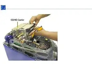 Remove the four screws connecting the CD/HD drive carrier to the the metal chassis (also known as the divider panel).