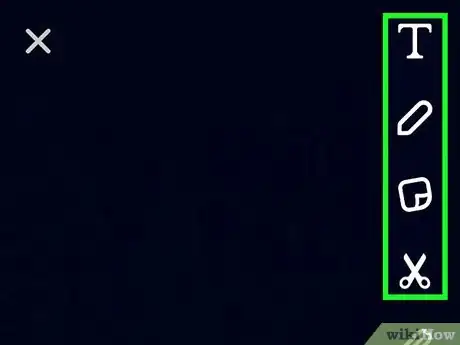 6Modifica i tuoi Snap. Usa le icone nella parte alta dello schermo per aggiungere disegni, testo e adesivi alle tue foto. Scorri a destra o a sinistra per usare un filtro.