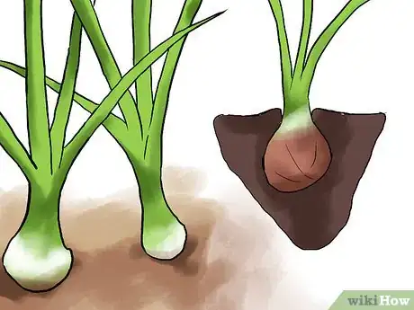 8Estrai l'intera cipolla. Se hai seminato i cipollotti dal bulbo, questo si sarà ridotto, dal momento che tutta l'energia è andata nella parte verde della pianta.