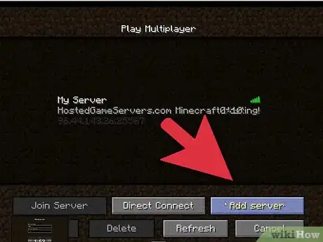 4Incolla l'indirizzo IP nel campo di testo. Premi "Entra nel server" e dovresti caricare la partita. Se compare un errore come "Server non aggiornato" o "Connessione fallita" e sei certo che la tua connessione a internet funzioni, potrebbe esserci un problema tecnico lato server. Non è raro che i server non funzionino o che le informazioni di accesso cambino e non siano aggiornate sui siti che le elencano, quindi non preoccuparti; scegline un altro e riprova.