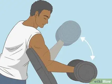 2Prova i curl con i manubri su panca inclinata. Questo esercizio limita i movimenti della schiena, isolando ulteriormente i bicipiti rispetto alla versione normale. Potresti dover ridurre il carico rispetto alla variante tradizionale per eseguire questo esercizio.[12]
