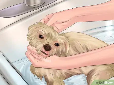 3Riempi la vasca di acqua tiepida prima di introdurvi il tuo amico a quattro zampe. L'acqua calda può danneggiare la pelle del cane, specialmente se è a pelo corto. Evita di lasciarla scorrere nella vasca mentre il cane è al suo interno, perché potrebbe stressarlo inutilmente. Dovresti prenderti del tempo per desensibilizzare il tuo amico a quattro zampe al suono dell'acqua che scorre. Avvaliti dell'aiuto dei suoi biscotti preferiti. Procedi sempre lentamente per evitare di innervosirlo e peggiorare la situazione per entrambi.