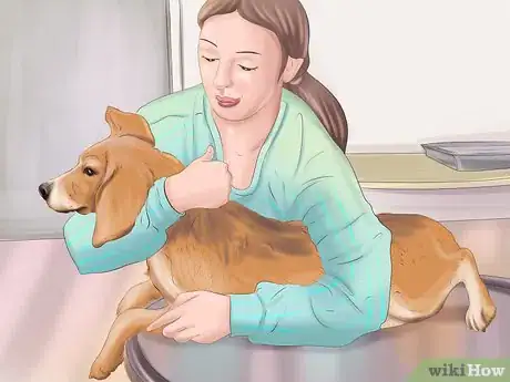 3Tieni fermo delicatamente il cane. Non dovrebbe muoversi, quindi usa un guinzaglio. Durante il taglio, puoi appoggiare la mano libera sotto la pancia per incoraggiarlo a rimanere fermo, invece di agitarsi.