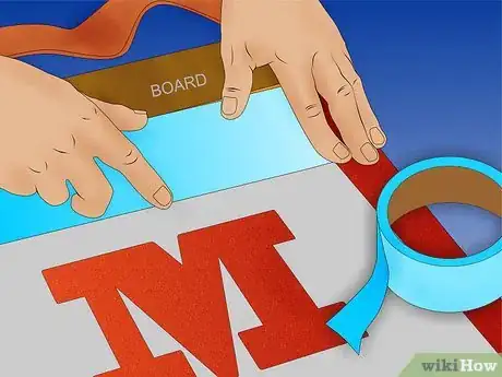 5Con del nastro da pittore, metti in risalto sulla base la zona su cui stamperai lo stencil, per assicurarti di metterlo dritto. Utilizza lo stencil positivo per aiutarti, senza lasciare spazio in più nella zona attorno a cui andrai a stampare. Posiziona lo stencil positivo sulla base e metti il nastro adesivo sugli angoli evitando di intaccare il disegno. Se vuoi che il tuo stencil abbia uno 'sfondo', vai al passaggio successivo e non lo rimuovere immediatamente.