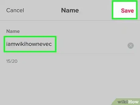 6Tocca il tuo ID TikTok per modificarlo. L'ID di TikTok appare nel secondo campo, accanto all'icona della sagoma umana. Puoi cambiarlo ogni 30 giorni. Tocca Salva in alto a destra per salvare le modifiche.